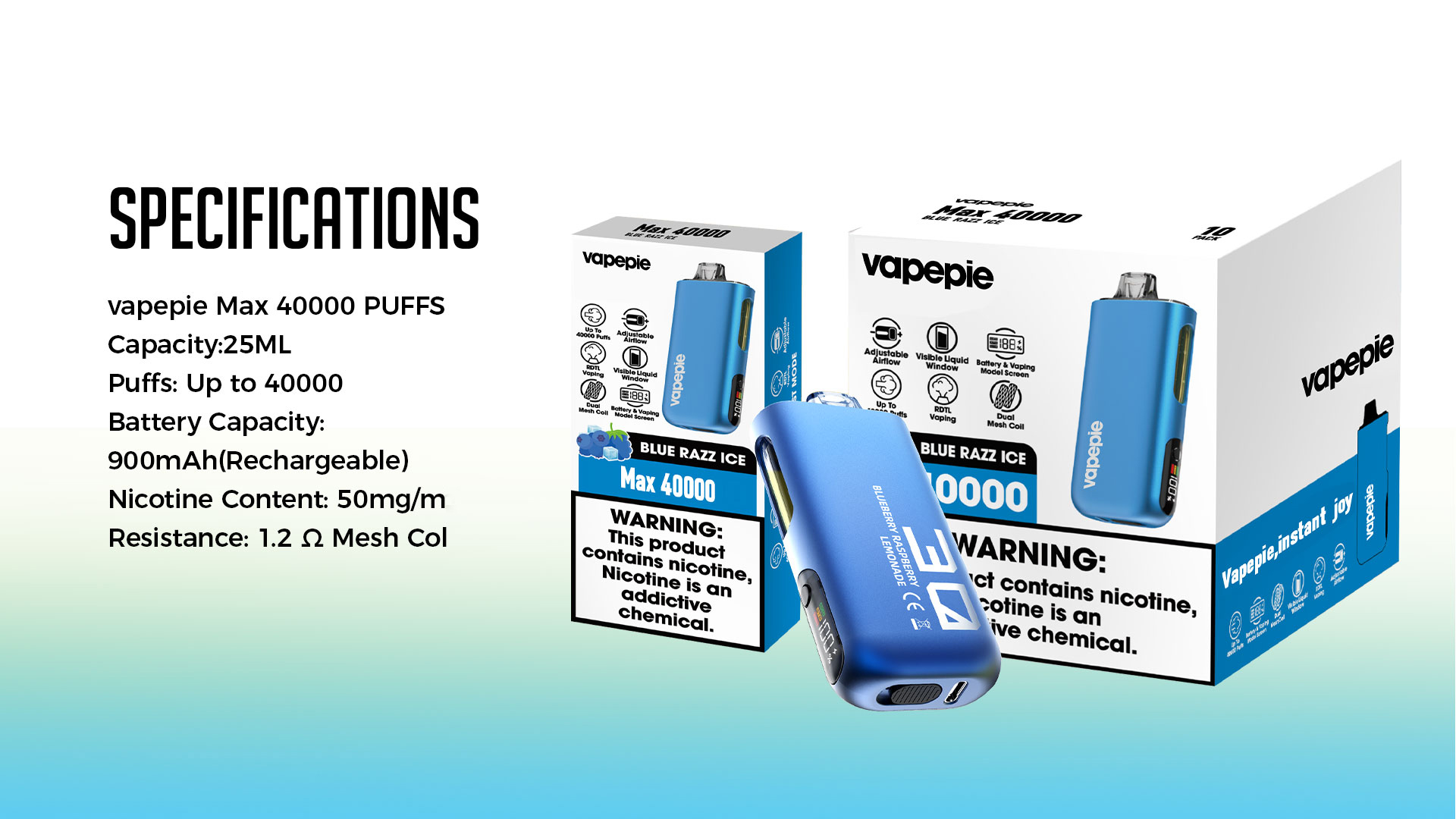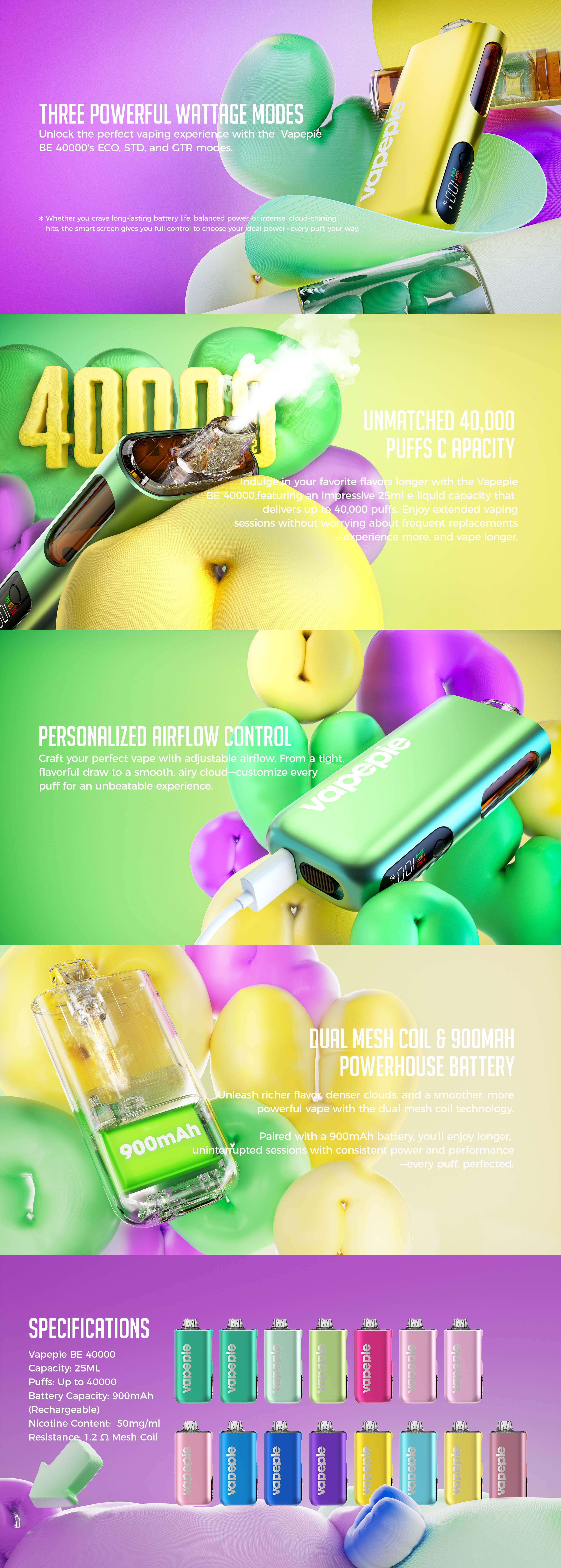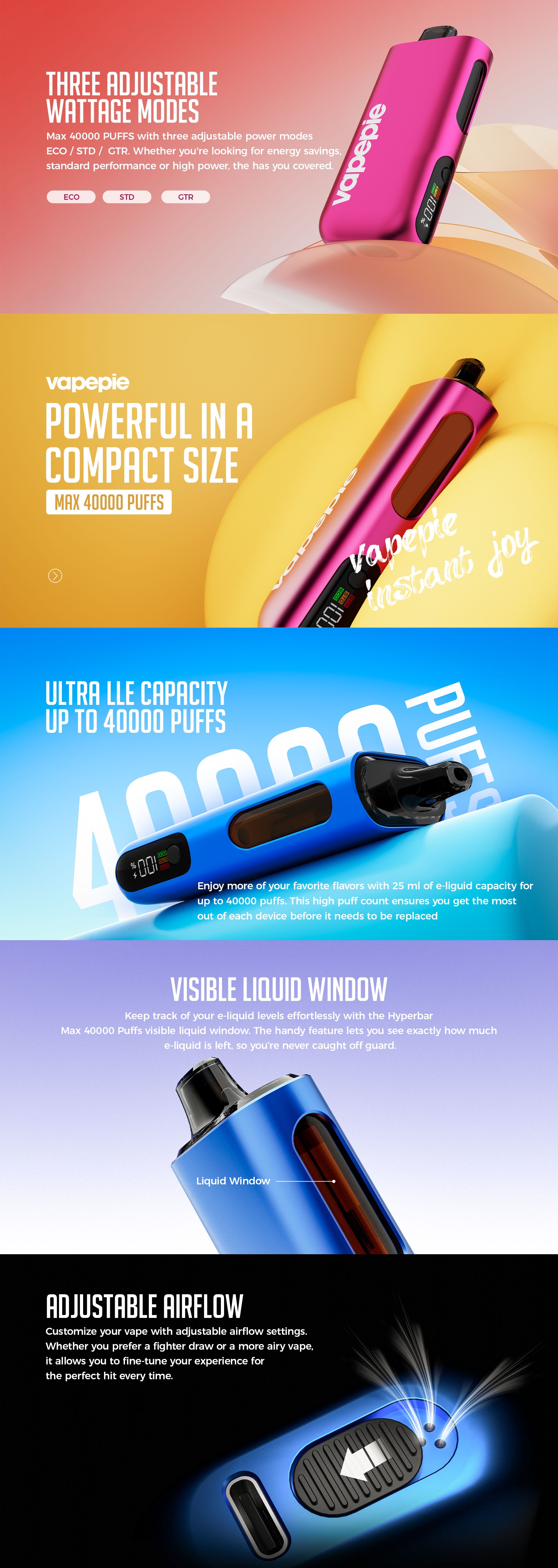 A jövő megérkezett. A Vapepie 40000 a piac egyik legfejlettebb készüléke, amely egyesíti a hatalmas kapacitást a hordozható kényelemmel. Három teljesítményfokozat, látható folyadékszint és akár 40 ezer slukk egyetlen eszközben.